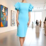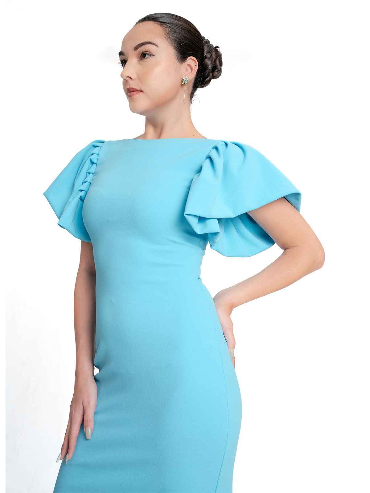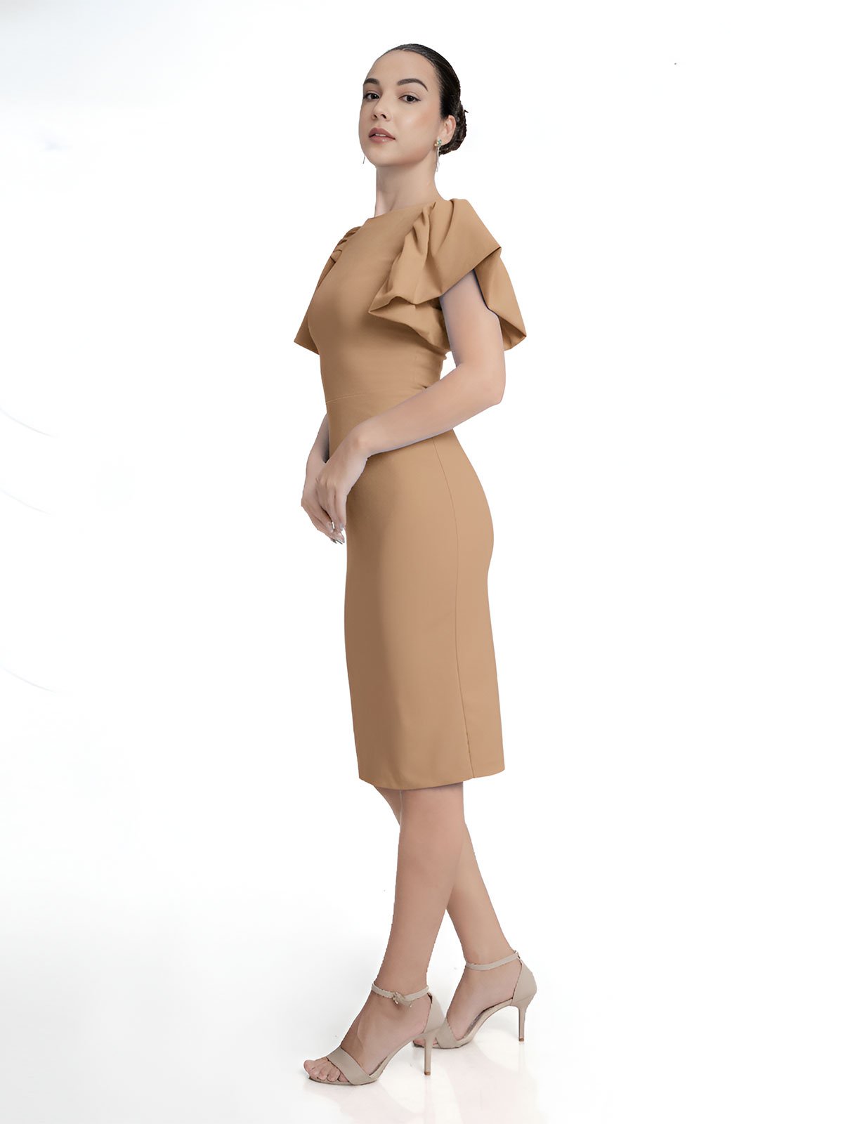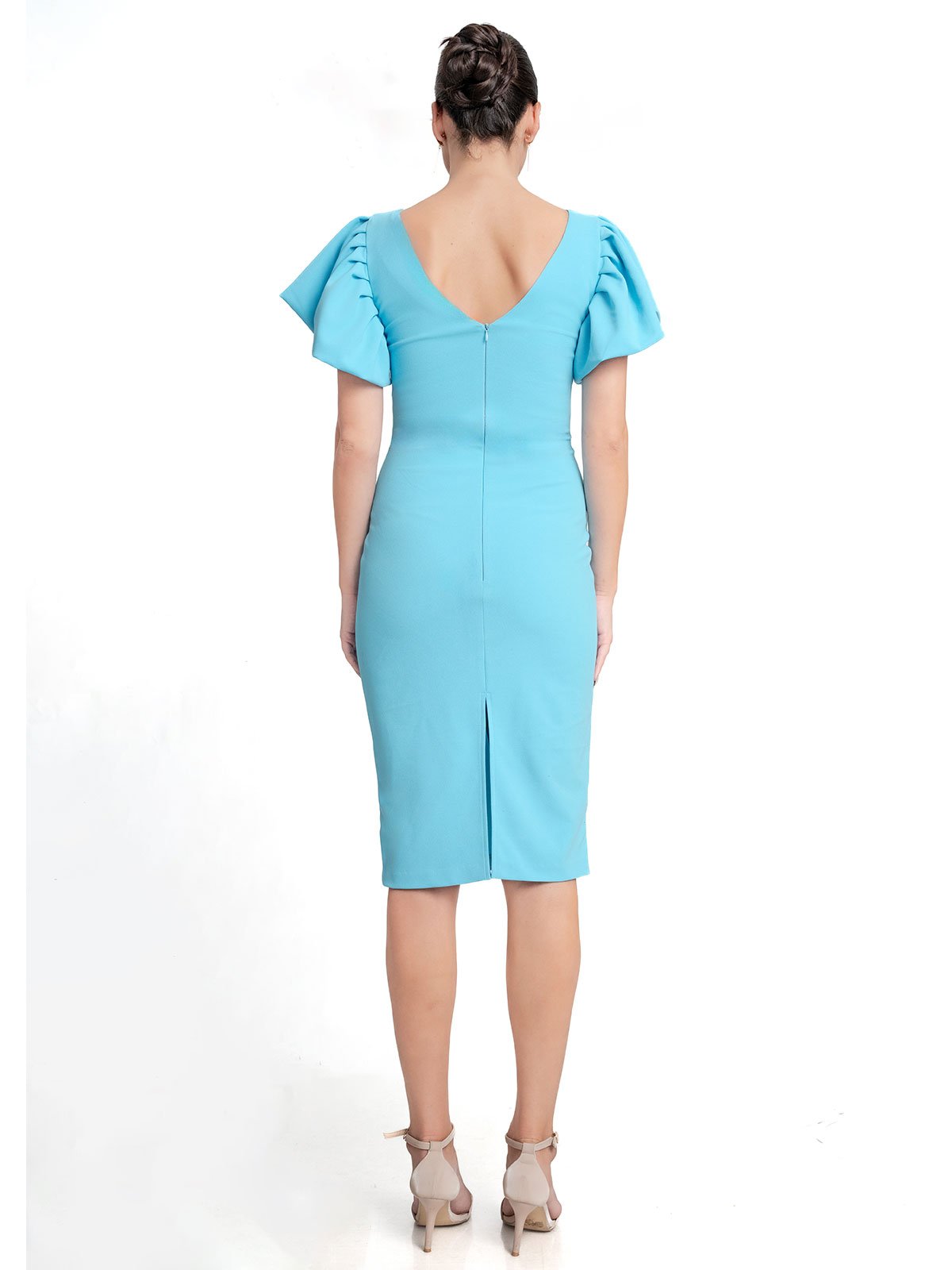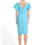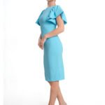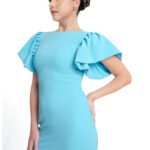 Dress Description: Ruffele Sleeve creationg a frilly, Flounced effect to this beautiful knee Length bodycon dress. Back zipper with Centre Back open gives you to walk comfortly.