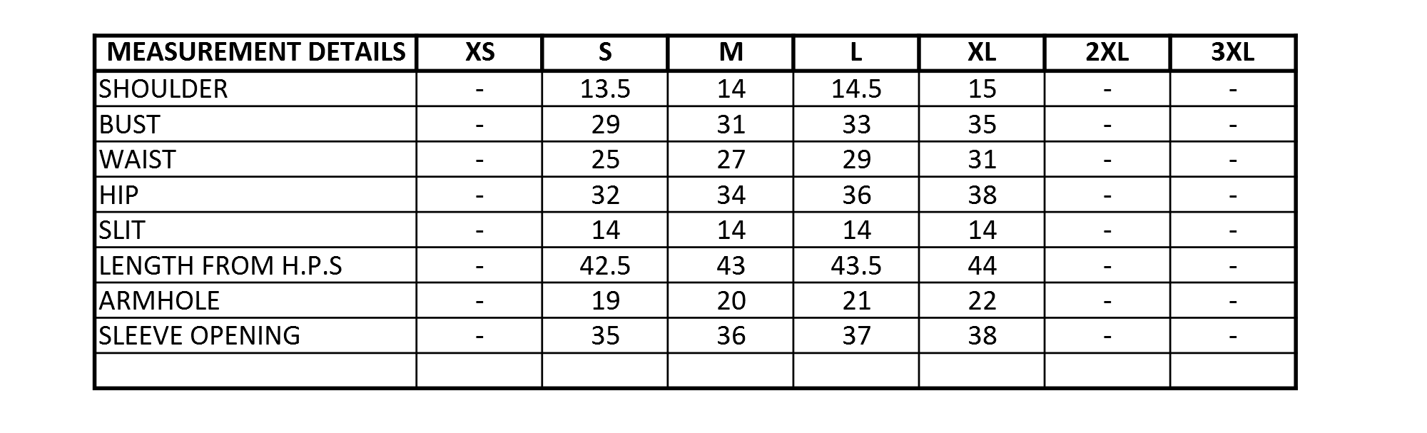 Size Chart: